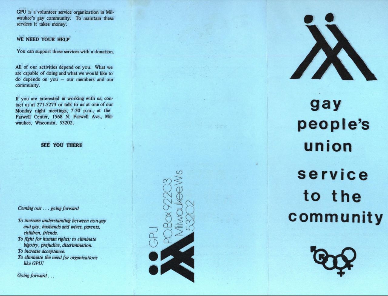 A GPU brochure. The logo comes from the Greek letter gamma, which was a symbol for gay people at the time. (From the Archives Department, University of Wisconsin-Milwaukee Libraries)