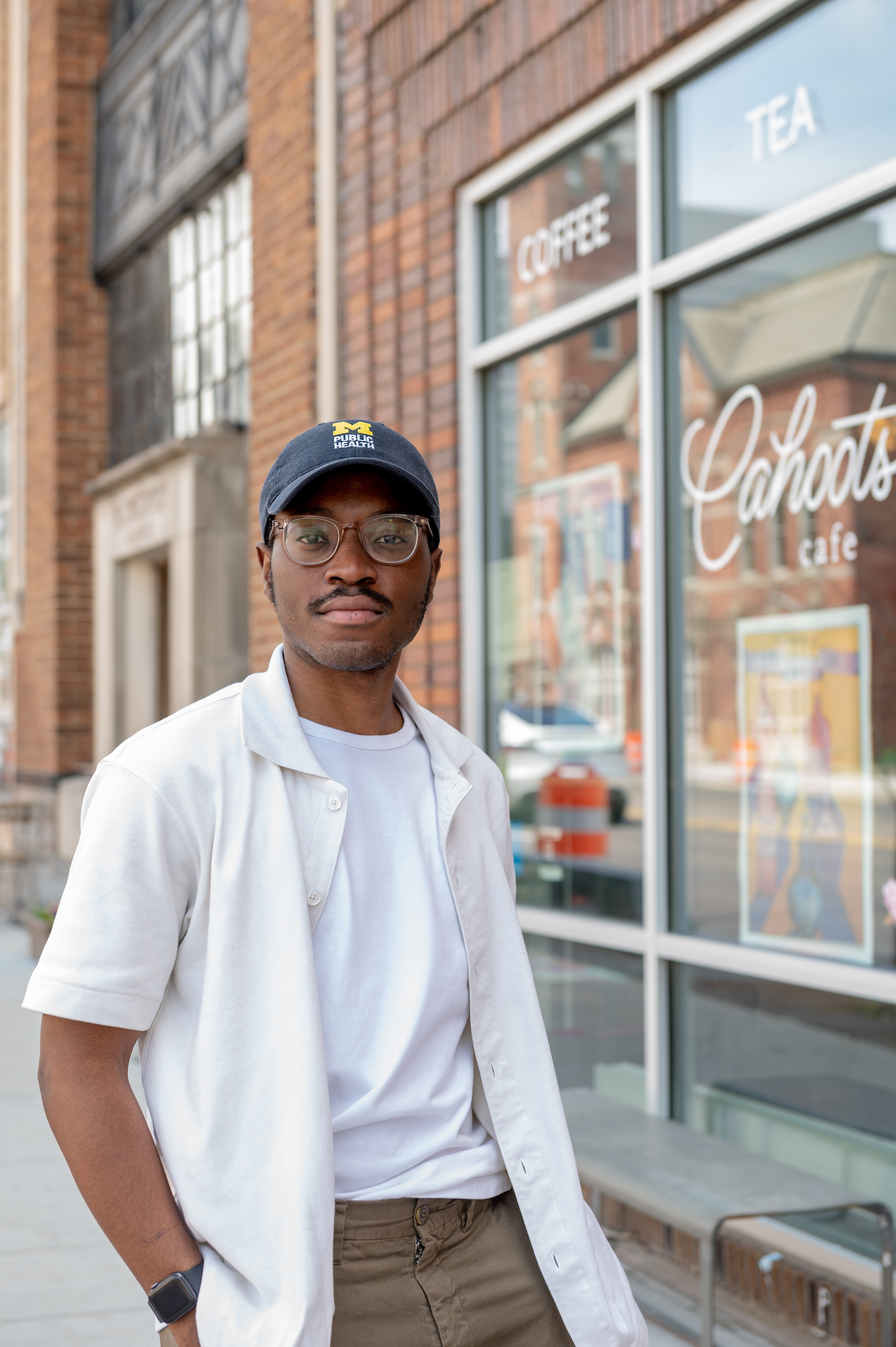 Coyne Gatto, University of Michigan Stamps School of Art & Design student, poses in front of his work at Zingerman’s Greyline. Gatto’s work is part of “The art of queer health sciences,” an exhibition on view at several downtown Ann Arbor businesses and at queeringart.com. Image credit: Eric Bronson/Michigan Photography.