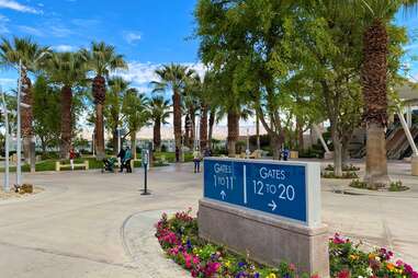Rain? Not really a problem, given the annual precipitation in Palm Springs averages just five inches. When it does drizzle, airport staff are ready with umbrellas and rugs to prevent passengers from slipping on the exposed walkways. More common in the desert is extreme heat, though there’s an answer for that too: sheltered gates, shade areas, misters, and climate control.