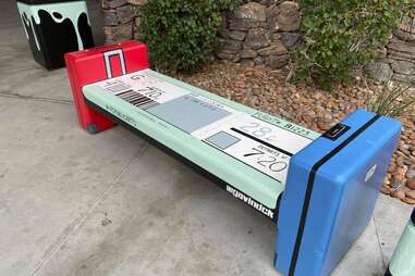 Outside the terminal, departing passengers may recognize what Meier refers to as the “art benches.” The color-blocked benches were painted by local artists as part of a beautification project by the Palm Springs Public Arts Commission, matching dozens more that are scattered downtown. Art inside the airport similarly reflects what you’ll find at the Palm Springs Art Museum, notably the Dale Chihuly glasswork on display in both.