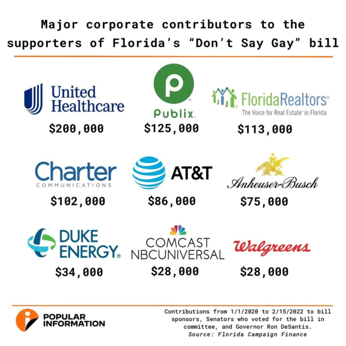 Yet, a recent Popular Information, a political Substack newsletter run by veteran progressive journalist and political staffer Judd Legum, investigation found some of the nation’s top companies – like Comcast/NBC Universal, UnitedHealth Group, Duke Energy, AT&T and Walgreens – have donated to the politicians behind the “Don’t Say Gay” bill.