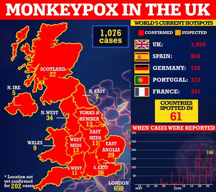 Monkeypox cases in the UK have risen above 1,000 as the rare tropical disease continues to spread. The UK Health Security Agency (UKHSA) said there had been 1,076 infections as of Sunday, almost double the number a fortnight ago, in a sign the outbreak is not slowing down