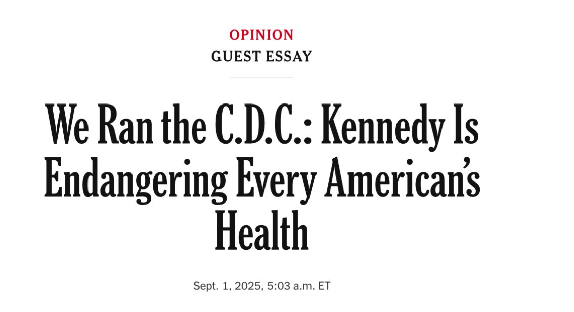 Home Entertainment We Ran the C.D.C.: Kennedy Is Endangering Every American’s Health – The... Entertainment We Ran the C.D.C.: Kennedy Is Endangering Every American’s Health – The New York Times By News Editor - September 1, 2025 124 0 Facebook Twitter Google+ Pinterest WhatsApp We Ran the C.D.C.: Kennedy Is Endangering Every American’s Health The New York Times Former CDC directors say RFK Jr. is endangering Americans’ health ABC News Former CDC leaders slam RFK Jr for endangering Americans’ health The Guardian Favorite RELATED ARTICLESMORE FROM AUTHOR Entertainment ‘Dangerous and alarming’: Google removes some of its AI summaries after users’ health put at risk – The Guardian Entertainment State of denial: How insurance companies impact health care today – CBS News Entertainment Some Americans say they’ll go without health insurance as ACA rates spike – CBS News Entertainment Is Giving ChatGPT Health Your Medical Records a Good Idea – Time Magazine Entertainment Brain Health Challenge: Doctor Appointments for Your Mind and Body – The New York Times Entertainment House passes bill extending health care subsidies, bucking GOP leaders – The Washington Post