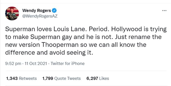 So yesterday, DC Comics announced what Bleeding Cool told you a couple of months ago, that Superman’s son, Jonathan Kent, was going to define himself as a bisexual new man, and had a new boyfriend in activist journalist Jay Nakamura. Not everyone reported the story quite as clearly in headlines or tweets, with “Superman Is Gay” being a common piece of clickbait. And one that Arizona State Senator, Wendy Rogers, fell for hook line and sinker.