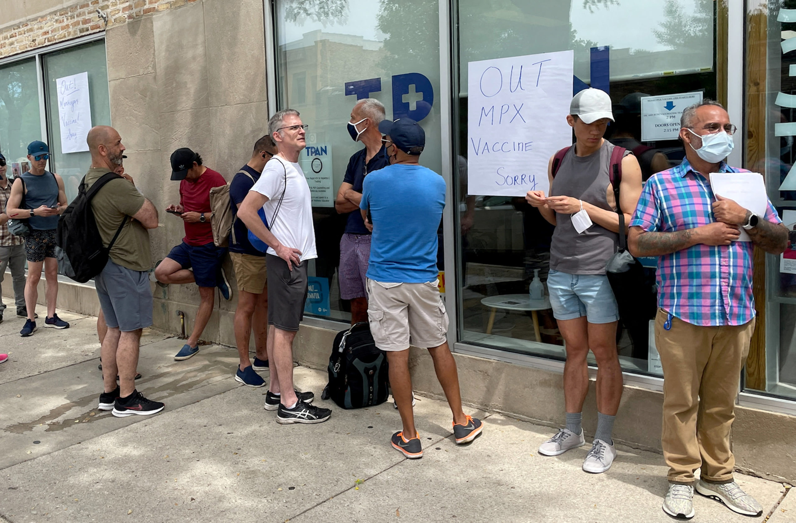 People line up outside the Test Positive Aware Network nonprofit clinic to receive the monkeypox vaccine in Chicago, Illinois, July 25, 2022
