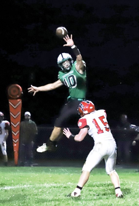 Waterford’s Jacob Huffman (10) goes up to deflect a pass during a high school football game against Caldwell earlier this season.