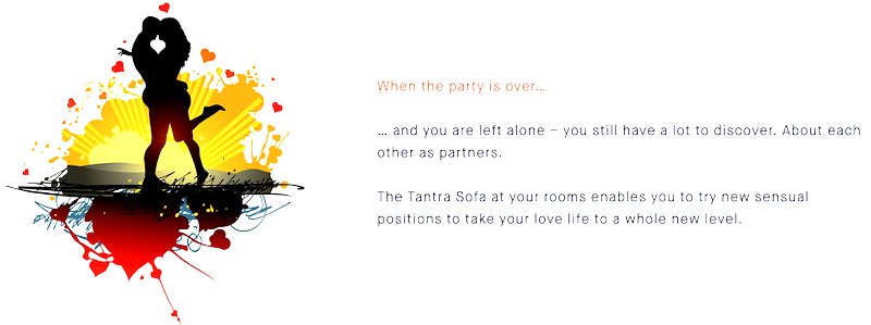 • It’s stated that “you still have a lot to discover” after the party is over, and “the Tantra Sofa at your rooms enables you to try sensual positions to take your love life to a whole new level”